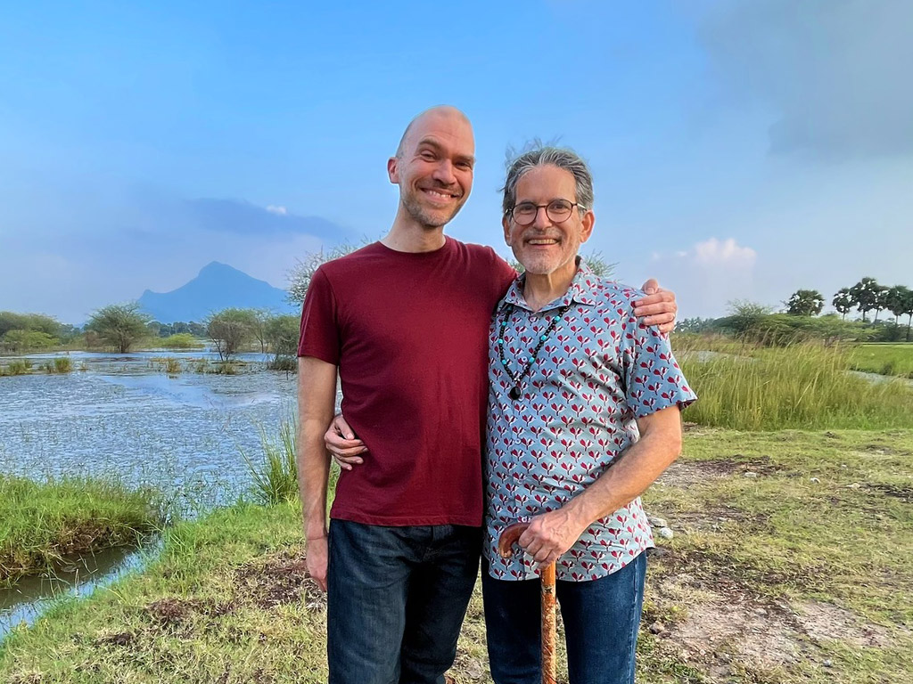 Tom with his root guru, Andrew Cohen, in Tiruvannamalai, India, December 2023, on the plains below the sacred Arunachala Hill.